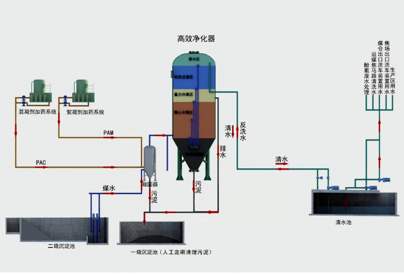 高效旋流多級污水凈化器是利用旋流閃混、常壓旋流、二級旋流離心分離、紊態(tài)造粒污泥層過濾、流態(tài)過濾的原理,將污水凈化中的混凝反應(yīng)、離心分離、泥層過濾、動(dòng)態(tài)過濾、污泥濃縮等處理技術(shù)有機(jī)組合集成在一起,在短時(shí)間內(nèi)完成高濁度廢水的多級凈化,實(shí)現(xiàn)了快速連續(xù)高效處理,出水可達(dá)到回用及排放標(biāo)準(zhǔn)。