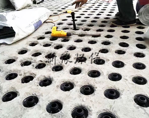 這是因為整體澆筑ABS濾板立體綁扎鋼筋和池壁的預埋鋼筋左右能成網狀結構和濾梁的預埋鋼筋上下形成立體結構,極大的提高了濾板整體荷載力和抗沖擊力。這是小塊預制濾板的預埋螺栓無法實現(xiàn)的。在曝氣生物濾池中濾料層的填充高度往往高達4m,因此荷載要高于給水中的濾池。