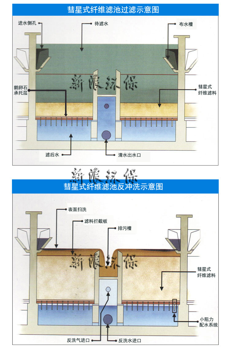 彗星式纖維濾池是一種重力式深層過濾池,它采用彗星式纖維濾料,小阻力配水布,氣水反沖,變水位或恒水位過濾方式,是目前深層過濾池中去除懸浮物較高效的過濾技術。